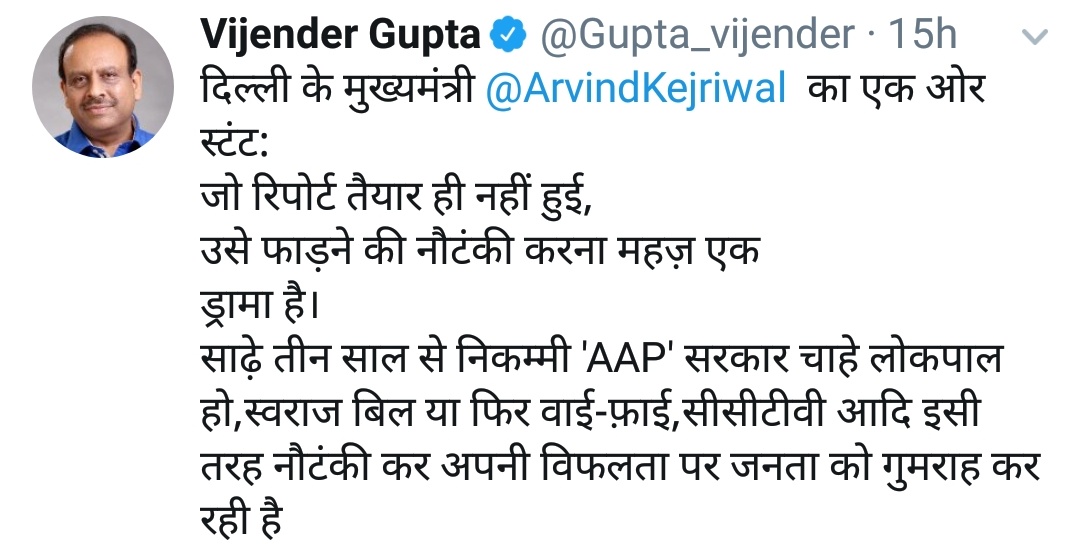 “In the last three-and-a-half years, the government has failed to govern and not delivered promises like WiFi, Lokpal, Swaraj Bill or CCTV. On one hand Kejriwal tears the draft report but on the other hand Satyendar Jain writes to L-G to extend the last date seeking comments on the report."