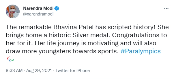 “The remarkable Bhavina Patel has scripted history! She brings home a historic Silver medal. Congratulations to her for it. Her life journey is motivating and will also draw more youngsters towards sports. #Paralympics”