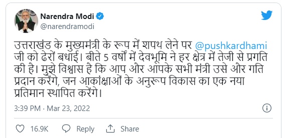 “उत्तराखंड के मुख्यमंत्री के रूप में शपथ लेने पर @pushkardhami जी को ढेरों बधाई। बीते 5 वर्षों में देवभूमि ने हर क्षेत्र में तेजी से प्रगति की है। मुझे विश्वास है कि आप और आपके सभी मंत्री उसे और गति प्रदान करेंगे, जन आकांक्षाओं के अनुरूप विकास का एक नया प्रतिमान स्थापित करेंगे।”