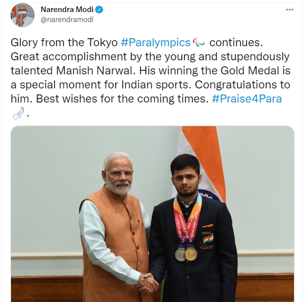 “Glory from the Tokyo #Paralympics continues. Great accomplishment by the young and stupendously talented Manish Narwal. His winning the Gold Medal is a special moment for Indian sports. Congratulations to him. Best wishes for the coming times. #Praise4Para.”