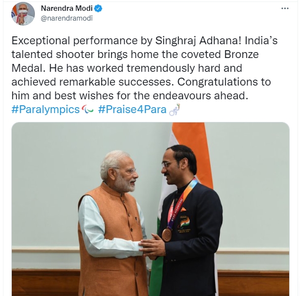 “Exceptional performance by Singhraj Adhana! India’s talented shooter brings home the coveted Bronze Medal. He has worked tremendously hard and achieved remarkable successes. Congratulations to him and best wishes for the endeavours ahead. #Paralympics #Praise4Para”