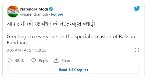 “आप सभी को रक्षाबंधन की बहुत-बहुत बधाई।