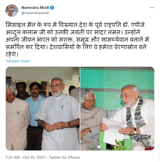 “मिसाइल मैन के रूप में विख्यात देश के पूर्व राष्ट्रपति डॉ. एपीजे अब्दुल कलाम जी को उनकी जयंती पर सादर नमन। उन्होंने अपना जीवन भारत को सशक्त, समृद्ध और सामर्थ्यवान बनाने में समर्पित कर दिया। देशवासियों के लिए वे हमेशा प्रेरणास्रोत बने रहेंगे।”