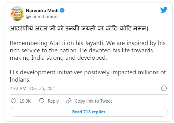 “Remembering Atal Ji on his Jayanti. We are inspired by his rich service to the nation. He devoted his life towards making India strong and developed.”