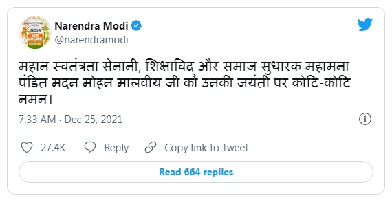 The Prime Minister also paid tributes to Pt. Madan Mohan Malaviya on his Jayanti.