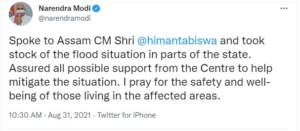 “Spoke to Assam CM @himantabiswa and took stock of the flood situation in parts of the state. Assured all possible support from the Centre to help mitigate the situation. I pray for the safety and well-being of those living in the affected areas.”