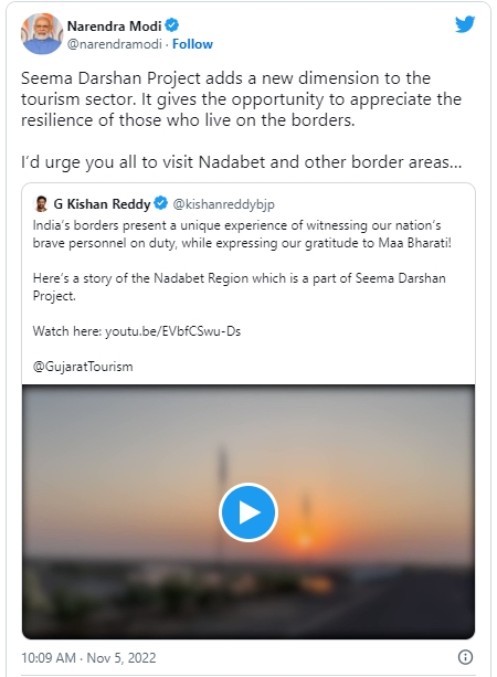 New Delhi (05/11/2022): The Prime Minister, Narendra Modi has urged the citizens to visit Nadabet and other border areas as part of Seema darshan to further tourism.