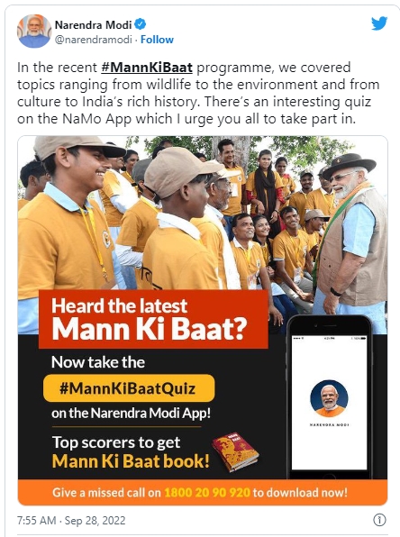 The Prime Minister, Narendra Modi has urged people to take part in quiz based on 25th September 2022 ‘Mann Ki Baat’ on NaMo App. Modi also said this month’s Mann Ki Baat covered topics ranging from wildlife to the environment and from culture to India’s rich history.