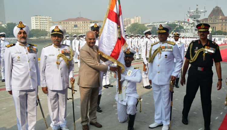 Mumbai (08/12/2021): The President of India, Ram NathKovind, presented President’s Standard to the 22nd Missile Vessel Squadron of the Indian Navy in Mumbai, Maharashtra today (December 8, 2021).