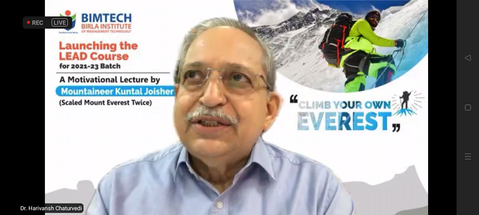 In coherence with the vision of ‘Developing Ethical Leaders with Entrepreneurial and Global Mindset Striving for Sustainability’, BIMTECH Gr Noida organised the launch of LEAD Program for its PGDM Batch of 2021-23 on Sep 1, 2021. Mr. Kuntal Joshier an accomplished mountaineer who has scaled Mount Everest twice graced the launch