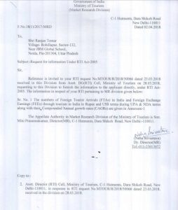 नॉएडा के युवा समाजसेवी एवं अधिवक्ता रंजन तोमर द्वारा डाली गई एक महत्वपूर्ण आरटीआई के सवालों से पर्यटन मंत्रालय से जुड़े कई चौकाने वाले तथ्य सामने आये हैं | आपको बता दे की रंजन तोमर ने आरटीआई के माध्यम से पर्यटन मंत्रालय भारत सरकार से कुछ तथ्यात्मक सवालों के जबाब माँगे थे | दरअसल रंजन तोमर का पहला सवाल था की 2014 में नरेंद्र मोदी के प्रधानमंत्री बनने के उपरांत एवं मनमोहन सिंह की पिछली सरकार में तथ्यात्मक रूप से विदेशी पर्यटन क्षेत्र में साल दर साल आमदनी अथवा नुकसान आदि के आंकड़े प्रदान करें ,दूसरा सवाल यह पूछा गया था की यदि बढ़ोतरी हुई है तो पर्यटक संख्या एवं कमाई का ब्यौरा दिया जाए |