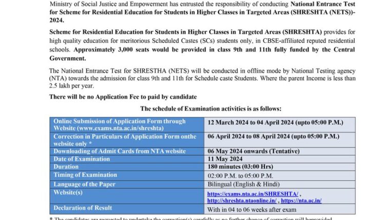 SHRESHTA (NETS)-2024: In continuation to Public Notice dated 12 March 2024 it is hereby informed that due to elections in few states of India the SHRESHTA 2024 Exam scheduled on 24th May 2024 will be preponed on 11th May 2024.