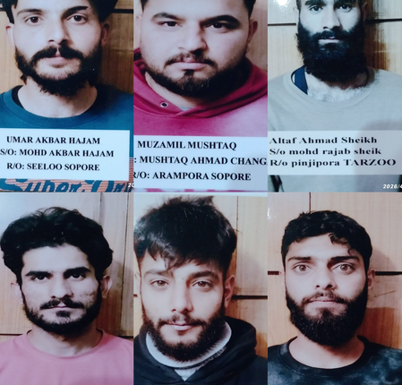 The individuals have been identified as Umar Akbar Hajam, son of Mohammad Akbar and resident of Seelu village in Baramulla; Salman Ahmed Shala, son of Mohammad Ramzan Shala and resident of Shalpora area in Sopore; Altaf Ahmed Sheikh, son of Mohammad Rajab Sheikh and resident of Panzipora Tarzoo village in Sopore; Mubashir Ahmed Gilkar, son of Fayaz Ahmed Gilkar and resident of Naseerabad area in Sopore; Muzammil Mushtaq Changa, son of Mushtaq Ahmed Changa and resident of Arampora village in Sopore; and Majid Firdous Dar, son of Firdous Ahmed Dar and resident of Chinkipora area in Sopore.