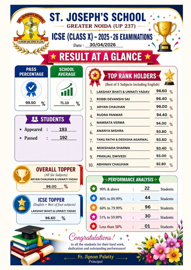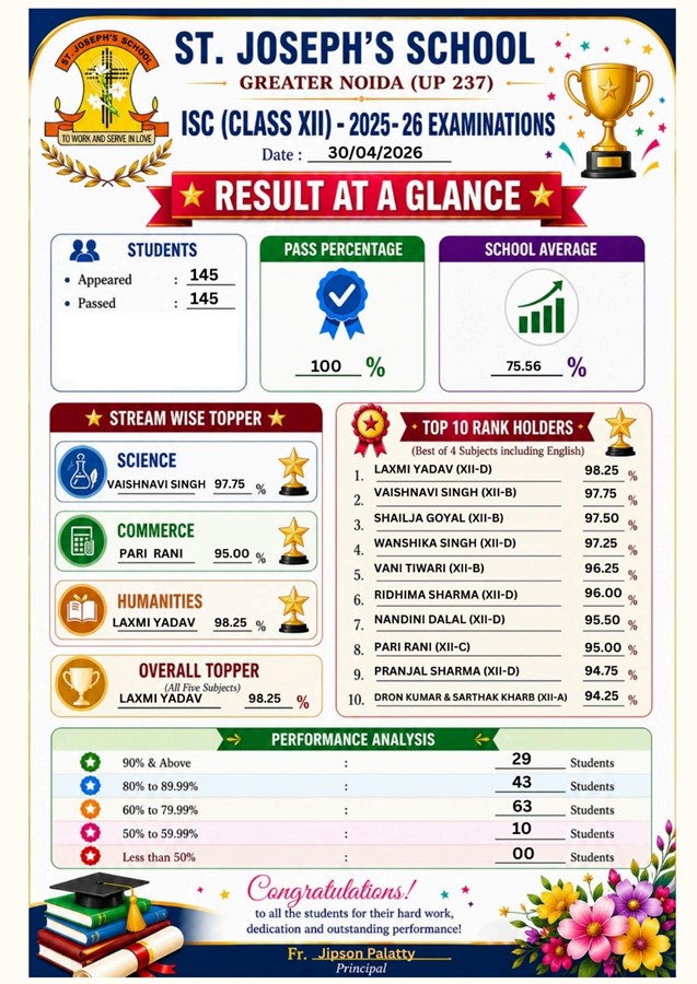 Greater Noida News (30/04/2026): St. Joseph’s School, Greater Noida has once again demonstrated its academic excellence by delivering outstanding results in the ICSE (Class X) and ISC (Class XII) board examinations for the 2025–26 academic session. The results reflect the institution’s consistent commitment to high-quality education and holistic student development.
