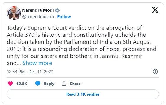 “Today’s Supreme Court verdict on the abrogation of Article 370 is historic and constitutionally upholds the decision taken by the Parliament of India on 5th August 2019; it is a resounding declaration of hope, progress and unity for our sisters and brothers in Jammu, Kashmir and Ladakh. The Court, in its profound wisdom, has fortified the very essence of unity that we, as Indians, hold dear and cherish above all else.
