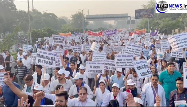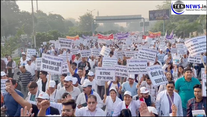 New Delhi (29/10/23): More than 10,000 doctors took out a massive procession in Delhi marching from Maulana Azad Medical College to Rajghat. Police placed heavy barricades and prevented the rally from proceeding towards Rajghat. Doctors protested strongly and sat on road for more than an hour.