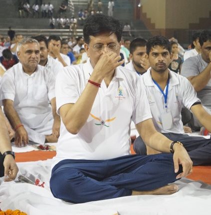 Central Minister having charge of Rail & coal ministry Piyush Vedprakash Goyal was the chief guest for the event. He was welcomed by MLA Jewar Dhirendra Singh who was also the convener for the whole program by presenting a bouquet to him. He then practiced various pranayam and asanas along with Greater Noida residents as guided by the yoga instructors present on the stage.