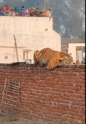Pilibhit, Dec 26 (IANS) The people of Atkona village in Uttar Pradesh’s Pilibhit have spent a sleepless night after a tiger, which came out of the Tiger Reserve Forest, continued to rest on a wall of a Gurudwara on Tuesday.