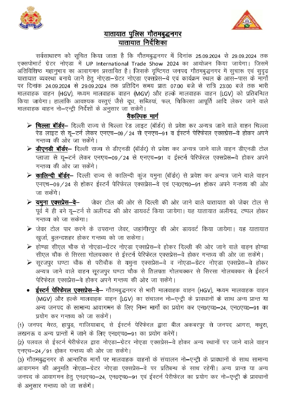 ग्रेटर नोएडा (24/09/2024): दिनांक 25.09.2024 से 29.09.2024 तक एक्सपोमार्ट ग्रेटर नोएडा में यूपी इण्टरनेशनल ट्रेड शो-2024 के आयोजन किया जायेगा। उक्त कार्यक्रम में दिनांक 25.09.2024 को वीवीआईपी/वीआईपी महानुभाव का आगमन/भ्रमण कार्यक्रम प्रस्तावित है, महानुभाव के आवागमन के दौरान कमिश्नरेट गौतमबुद्धनगर में आकस्मिक स्थिति में नोएडा-ग्रेटर नोएडा एक्सप्रेस-वे एवं एक्सपोमार्ट ग्रेटर नोएडा के आस-पास मार्गो पर अल्प समय के लिए यातायात डायवर्जन किया जायेगा। वाहन चालक यातायात असुविधा से बचने हेतु निम्नांकित मार्गाें का प्रयोग कर सकते है –