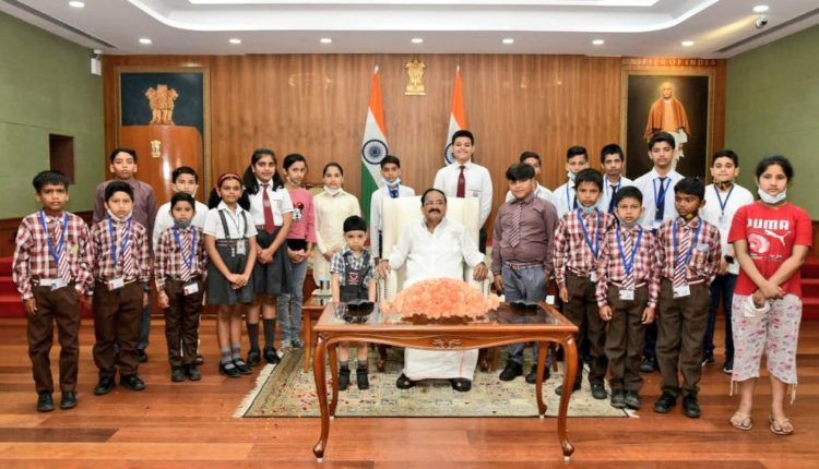 new Delhi (18/03/2022): The Vice President, M. Venkaiah Naidu today celebrated Holi with school children and Secretariat staff at Upa-Rashtrapati Nivas today. Children from four Delhi schools, including those run by MCD, visited the Vice President’s residence and greeted him on the occasion of Holi. The Vice President was delighted when the enthusiastic children recited patriotic poems.